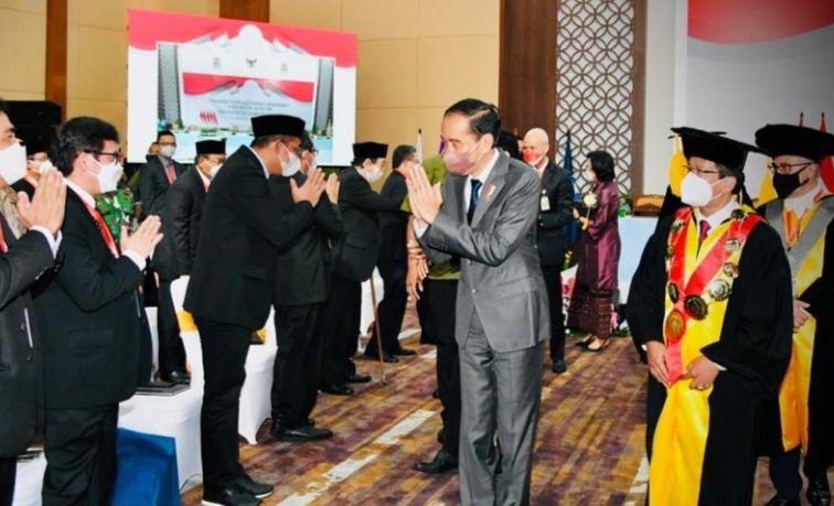 INDONESIANEWS.TV- SEMARANG: Presiden RI Joko Widodo (Jokowi) menghadiri Sidang Terbuka Senat Akademik Dies Natalis ke-46 Universitas Sebelas Maret (UNS) yang digelar di UNS Tower Ki Hadjar Dewantara, Kota Surakarta, Provinsi Jawa Tengah, Jumat (11/3/2022).