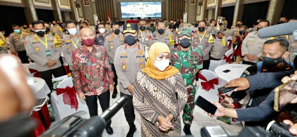 INDONESIANEWS.TV – SURABAYA: Forkopimda Jawa Timur Gubernur Jatim Khofifah Indar Parawansa, Pangdam V/Brawijaya Mayjen TNI Nurchahyanto, Kapolda Jatim Irjen Pol Nico Afinta, Kabagops Binda Jatim yang mewakili Kabinda Jatim, Kasgartap III/Surabaya, pejabat utama Kodam V/Brawijaya, pejabat utama polda Jatim, para Kapolres/ta seJatim serta stakeholder terkait menghadiri Rapat Koordinasi Lintas Sektoral Dalam Rangka Operasi Terpusat Ketupat Semeru 2022, yang diadakan di Gedung Mahameru Mapolda Jatim, pada Selasa (19/4/2022).
