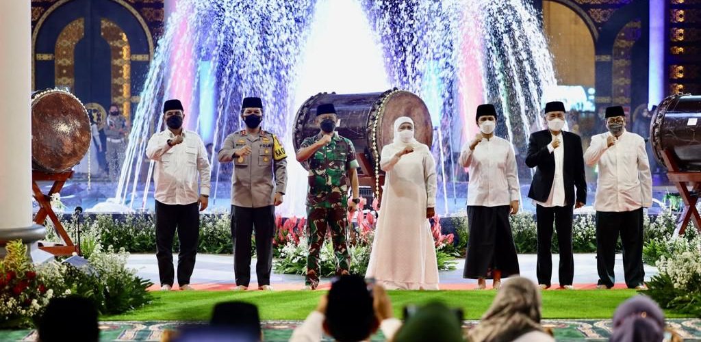 JAKARTANEWS.ID – SURABAYA: Forkopimda Jawa Timur Khofifah Indar Parawansa, Pangdam V Brawijaya Mayjend TNI Nurchahyanto, Kapolda Jatim Irjen Pol Nico Afinta bersama Kabinda Jatim Marsma TNI Rudy Iskandar, Minggu (1/5/2022) malam, mengikuti Parade bedug di Masjid Nasional Al-Akbar Surabaya.