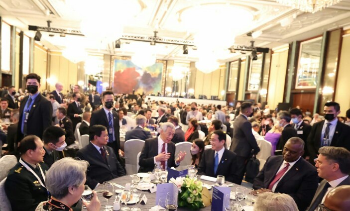 Pada kesempatan ini, Prabowo duduk satu meja dengan PM Singapura Lee Hsien Long, PM Jepang Fumio Kishida, Menhan AS Lloyd J Austin, Menhan Australia Richard Donald Marles, dan Menhan Tiongkok Jenderal Wei Fenghe.