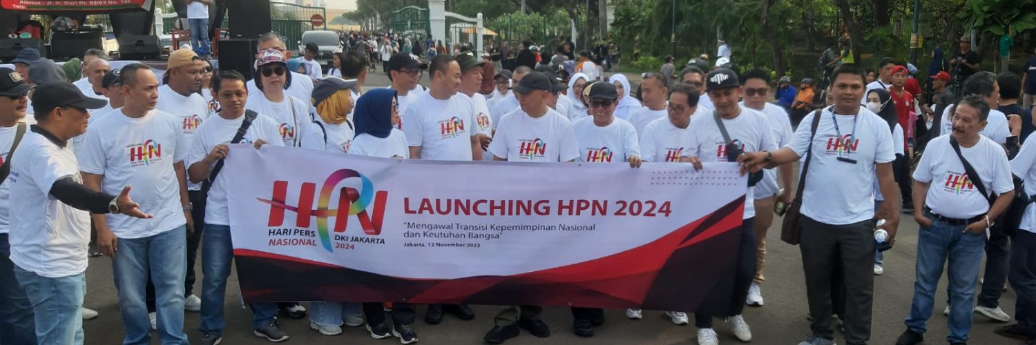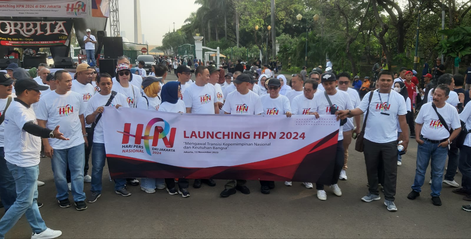 Jalan santai Launching HPN (Hari Pers Nasional) 2024 diikuti oleh ratusan anggota PWI membentangkan spanduk bertuliskan “Mengawal Transisi Kepemimpinan Nasional dan Keutuhan Bangsa.”