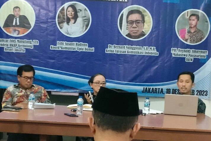 Hadir sebagai Nara sumber Ketua YKI Dr. Bernard Nainggolan. SH.MH, Koordinator Komunitas Cipta Damai Esthi Susanti Hudiono, dan moderator Halomoan Siburian.