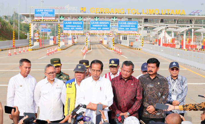 KOTA DEPOK: Menteri Agraria dan Tata Ruang/Kepala Badan Pertanahan Nasional (ATR/BPN), Hadi Tjahjanto mendampingi Presiden Joko Widodo meresmikan Jalan Tol Pamulang-Cinere-Raya Bogor pada Senin (08/01/2024). Peresmian berlangsung di Gerbang Tol (GT) Limo Utama, Kota Depok, Provinsi Jawa Barat.