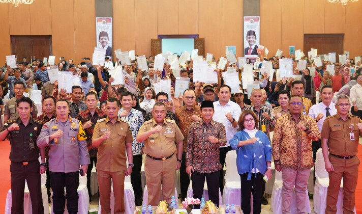 PEKANBARU: Sebanyak 500 sertipikat tanah hasil program Pendaftaran Tanah Sistematis Lengkap (PTSL) diserahkan Wakil Menteri Agraria dan Tata Ruang/Wakil Kepala Badan Pertanahan Nasional (Wamen ATR/Waka BPN), Raja Juli Antoni kepada masyarakat Kota Pekanbaru pada Senin (08/01/2024). Penyerahan sertipikat ini berlangsung di Auditorium HM Rusli Zainal, Kantor Dinas Pekerjaan Umum Provinsi Riau.