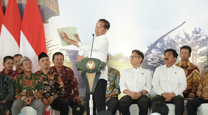 Seusai menyerahkan sertipikat, presiden bercerita soal masa awal dirinya menjabat sebagai orang nomor satu di Indonesia. “Dulu tahun 2015, setiap saya ke desa, setiap saya ke kampung, ngecek infrastruktur, setiap saya ke daerah ke mana pun, provinsi mana pun, yang saya dengar adalah sengketa dan konflik lahan, selalu,” kata Presiden RI.